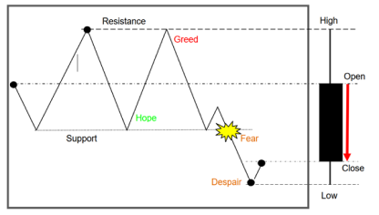 • Assuming we are buyers, we have “hope” for a resurgence higher from support, “greed” for the second profitable run, with instinctive expectations of a new high, and, last but not least, “fear” of potentially “getting it wrong” as price fails at resistance, and “despair” of the unknown as price accelerates downward through support, eventually capitulating into uncharted territory.
